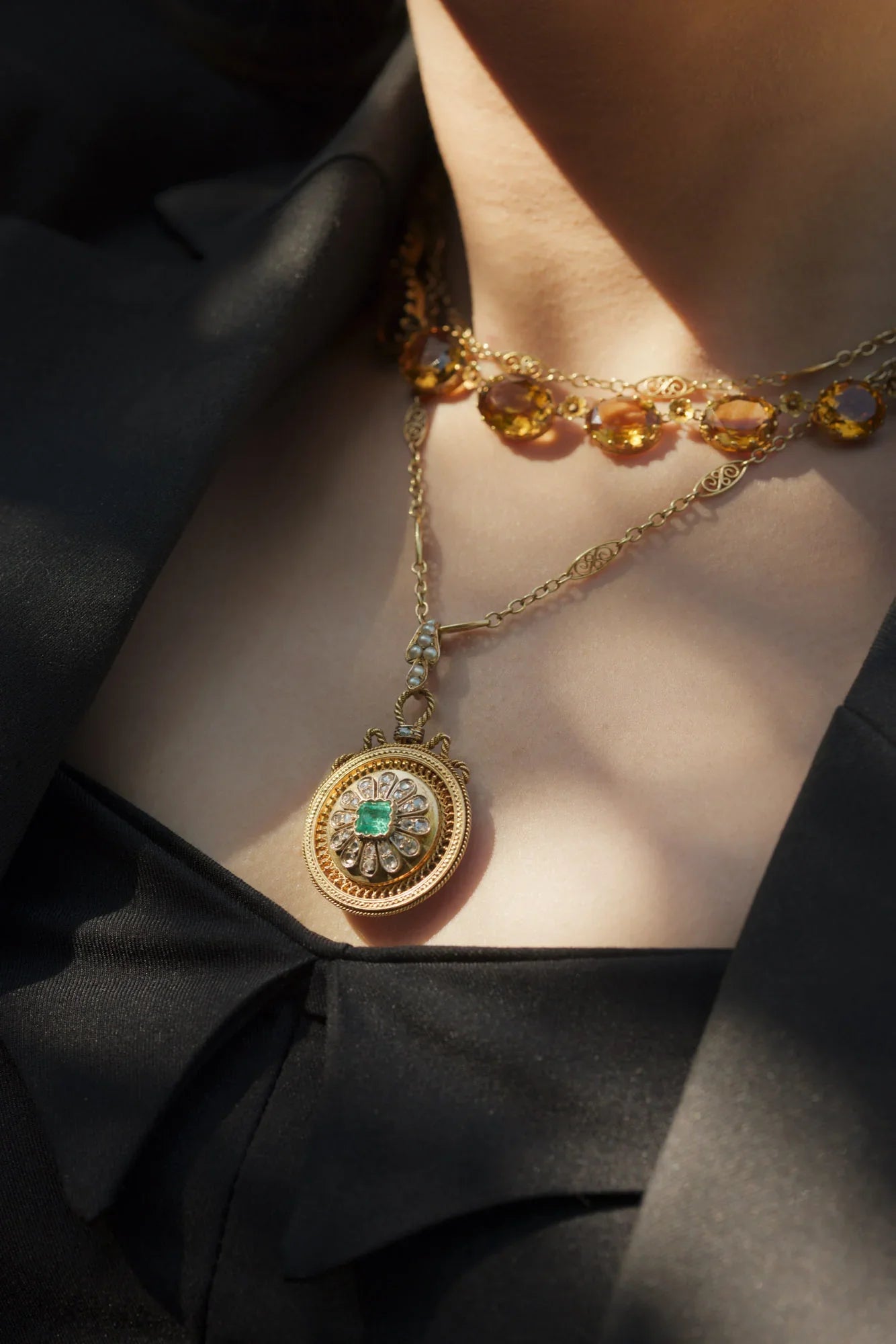 Victorian 18K gold LFG certified Colombian Emerald Diamonds Daisy locket