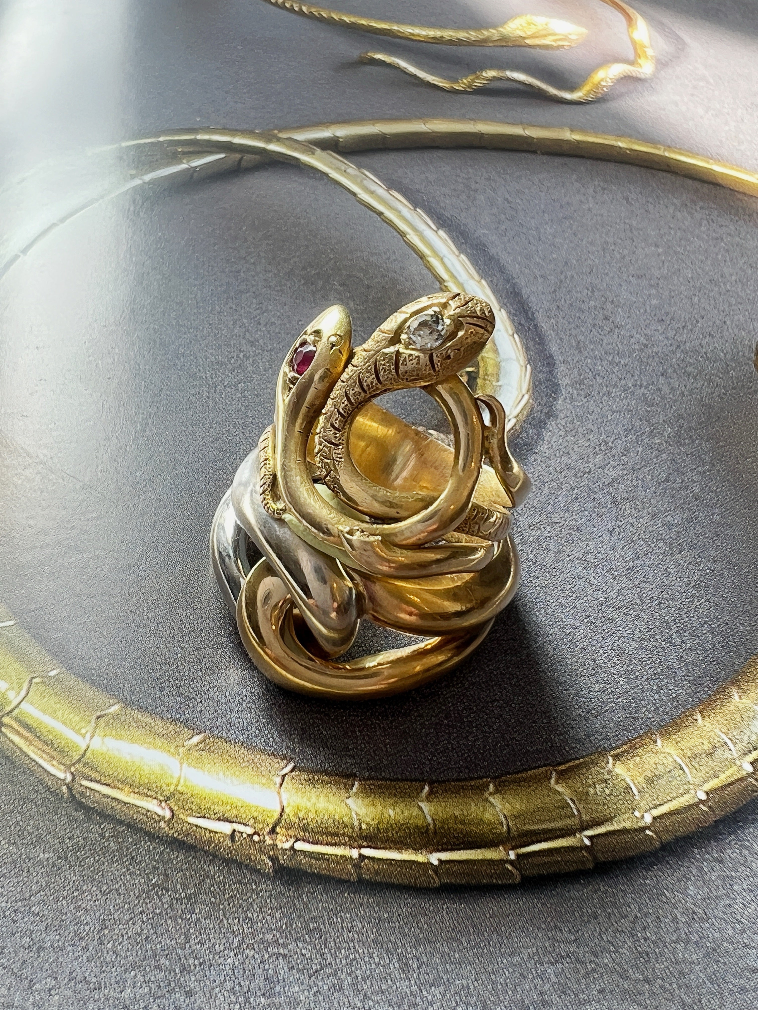 Victorian era 18K Gold diamond ruby Double Snake Ring