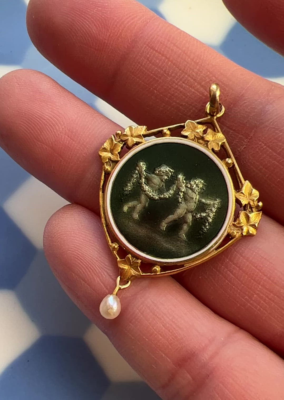 Victorian era 18K gold diamond pearl green enameled pendant