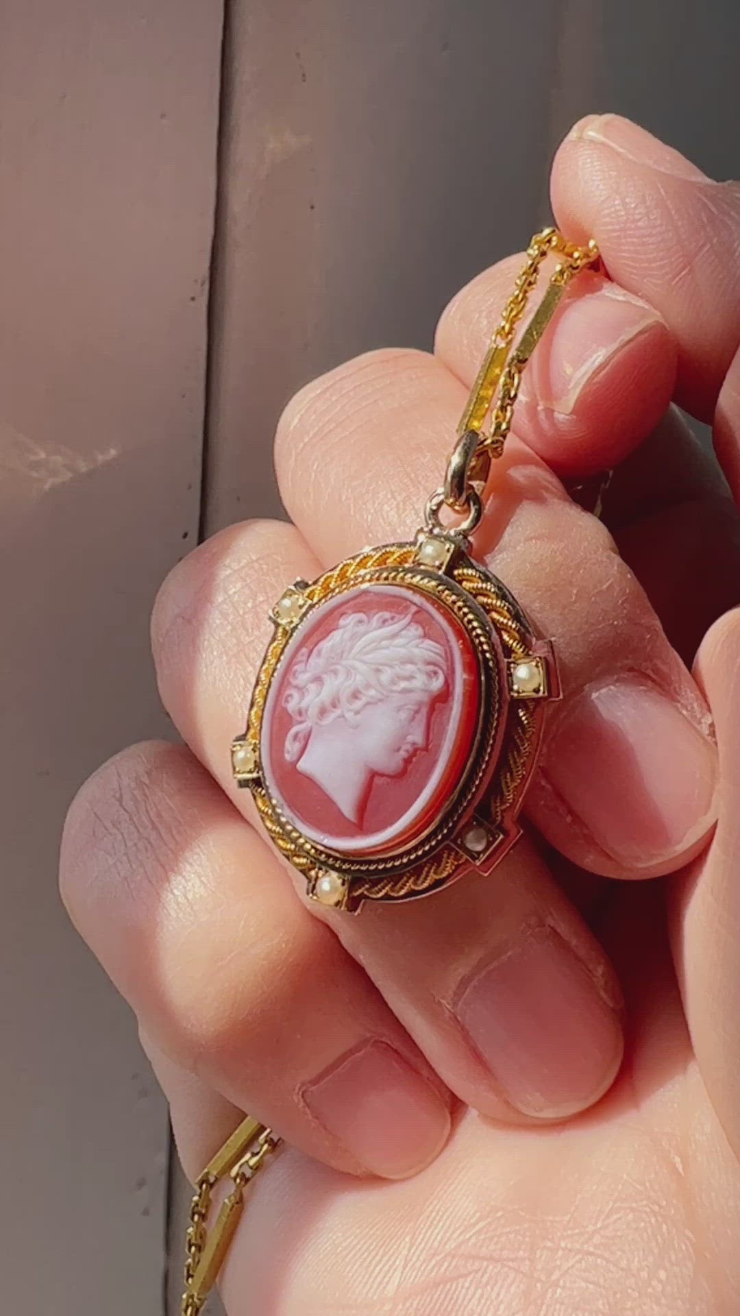 Antique 18K gold agate cameo pearl pendant