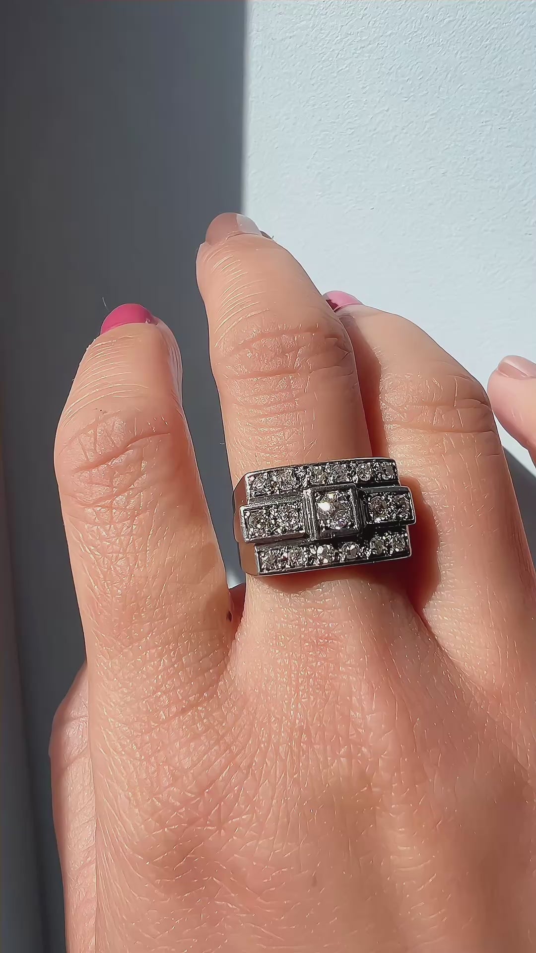A true embodiment of refined French craftsmanship, this striking 1940s Tank ring is the perfect balance of strength and elegance. Crafted in luminous 18K white gold, the ring draws on the bold, architectural lines that defined the Tank style—originally inspired by the powerful forms of military tanks during World War II. French jewelers translated this mechanical inspiration into jewelry that celebrates clean lines, structural presence, and modernist simplicity.