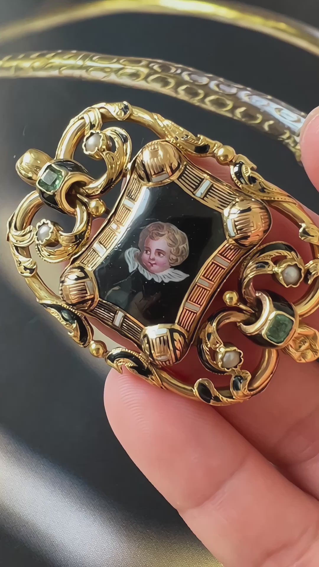 Antique 18K gold cherub brooch with emeralds and natural pearls