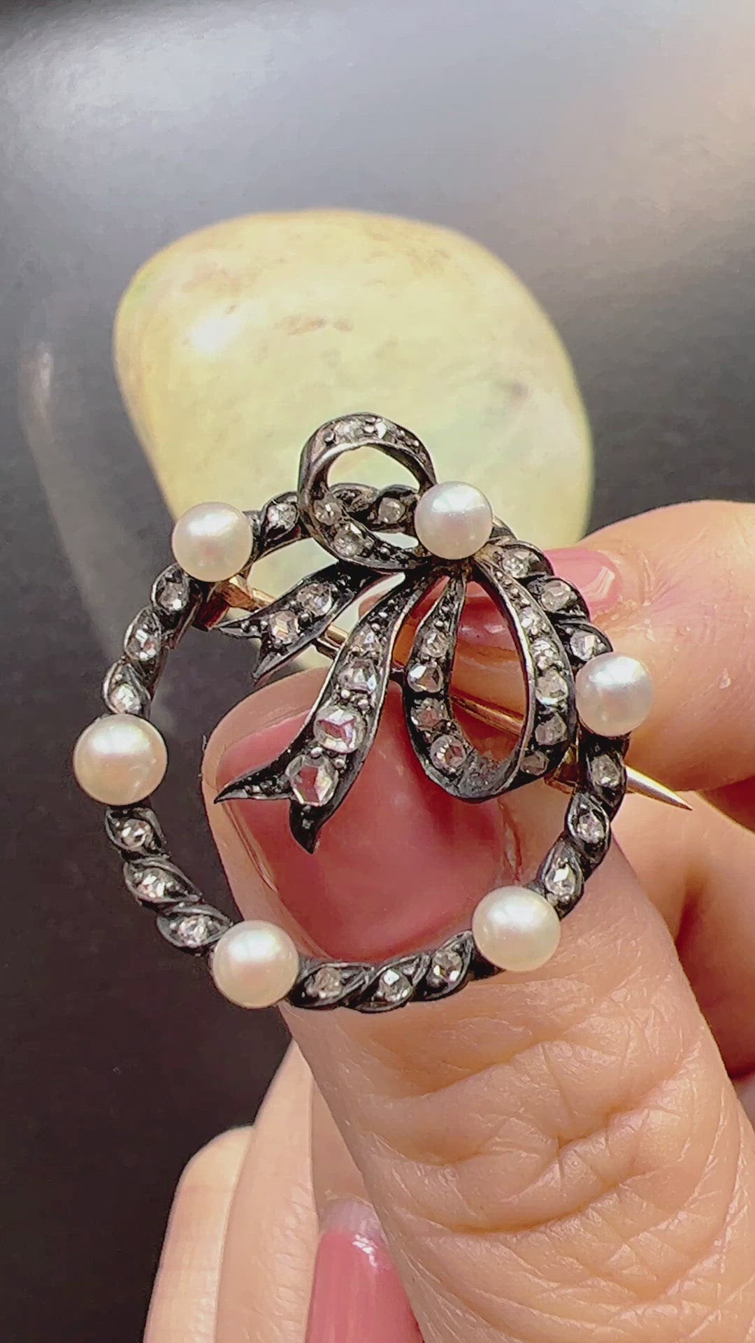 Elegant and feminine, the bow is a fine jewelry motif that never goes out of style. For sale a French antique bow brooch, which takes this motif and brought it together with the combination of the sparkle of diamonds and the rich luster of 6 white pearls. The precious gemstones are first mounted in silver and then in 18K yellow gold. The brooch is dated back to the mid 19th century, the Victorian era.