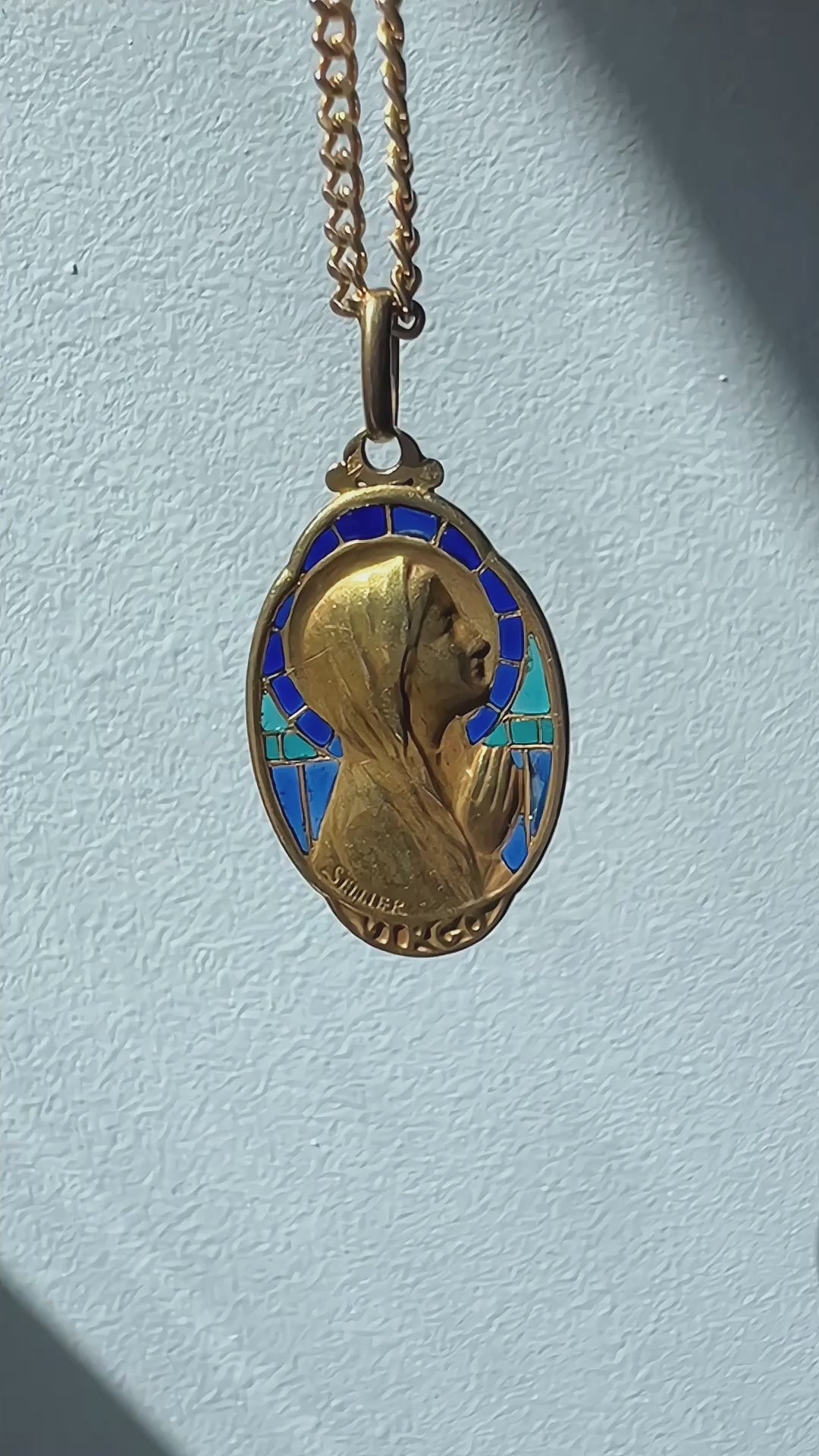 Antique 18K plique à jour enamel signed SELLIER Virgin Mary pendant - Curiously timeless