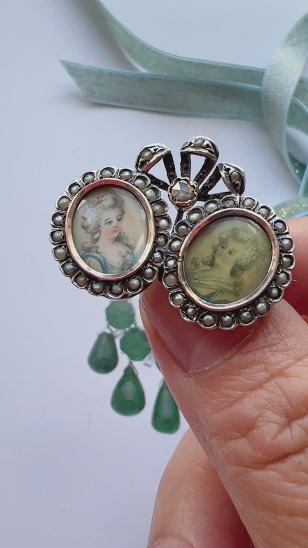 Antique double miniature portraits diamond pearl brooch