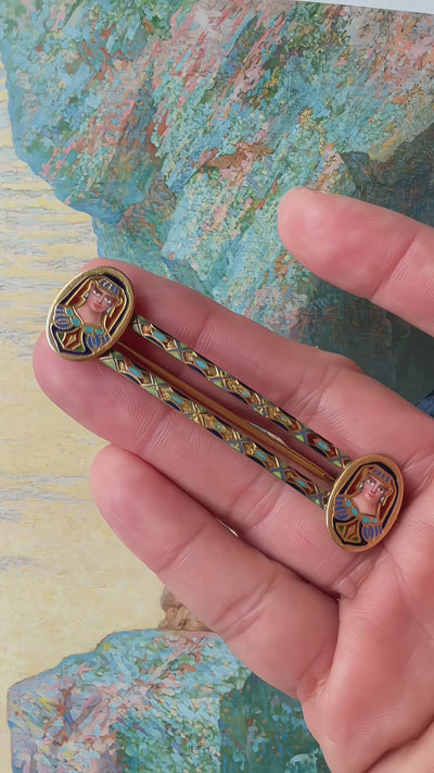 Egyptian Revival jewelry, often referred to as Egyptomania, became especially popular in the late 19th and early 20th centuries following major archaeological discoveries and a growing fascination with ancient Egyptian culture. These pieces are characterized by stylized profiles, symbolic motifs, bold geometric forms, and colorful enamel work, all inspired by the iconography of ancient Egypt.