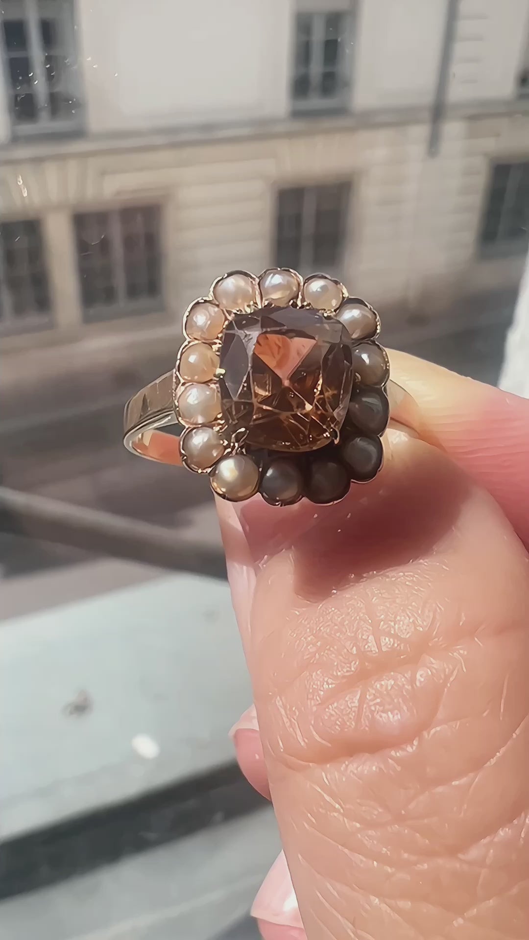 The central zircon is beautifully framed by a circle of natural seed pearls, enhancing its allure and creating a more substantial presence when worn. The ring is stamped with French owl hallmark for 18K gold on the shank.