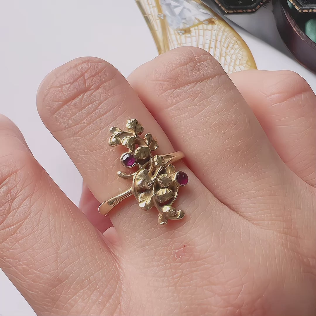 Crafted with meticulous attention to detail, the ring features two vivid red rubies nestled among the leaves, resembling the luscious fruits of the ivy plant. The vertical form of the ring's head mirrors the natural growth pattern of ivy as it winds its way up walls, creating a harmonious fusion of nature-inspired design and artistic ingenuity.
