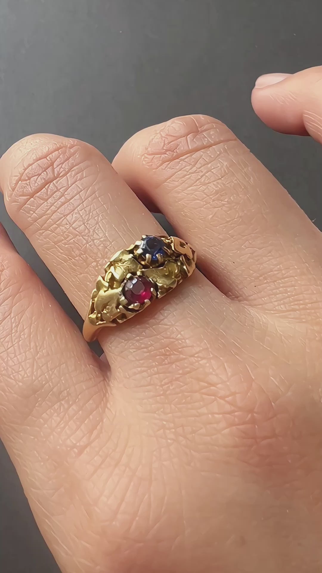 Experience the exceptional craftmanship of the Art Nouveau era with this beautiful 18K gold ring, featuring one blue sapphire and one rich garnet, delicately encircled by ivy leaves in gold weave their way around the band, capturing the essence of nature's beauty.