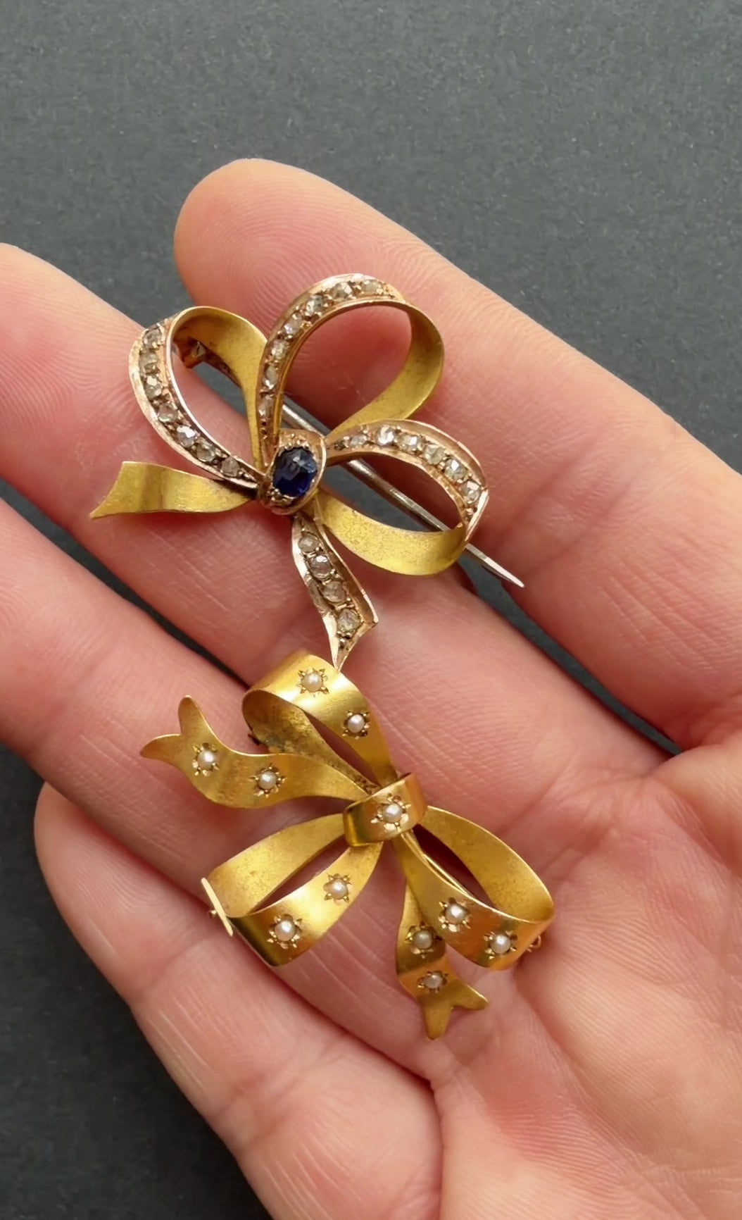 The first bow sparkles with 24 rose-cut diamonds (approx. 0.2ct total) and a blue sapphire (approx. 0.2ct) at its heart, while the second is adorned with 11 natural seed pearls, each accentuating the soft curves of the gold ribbon.