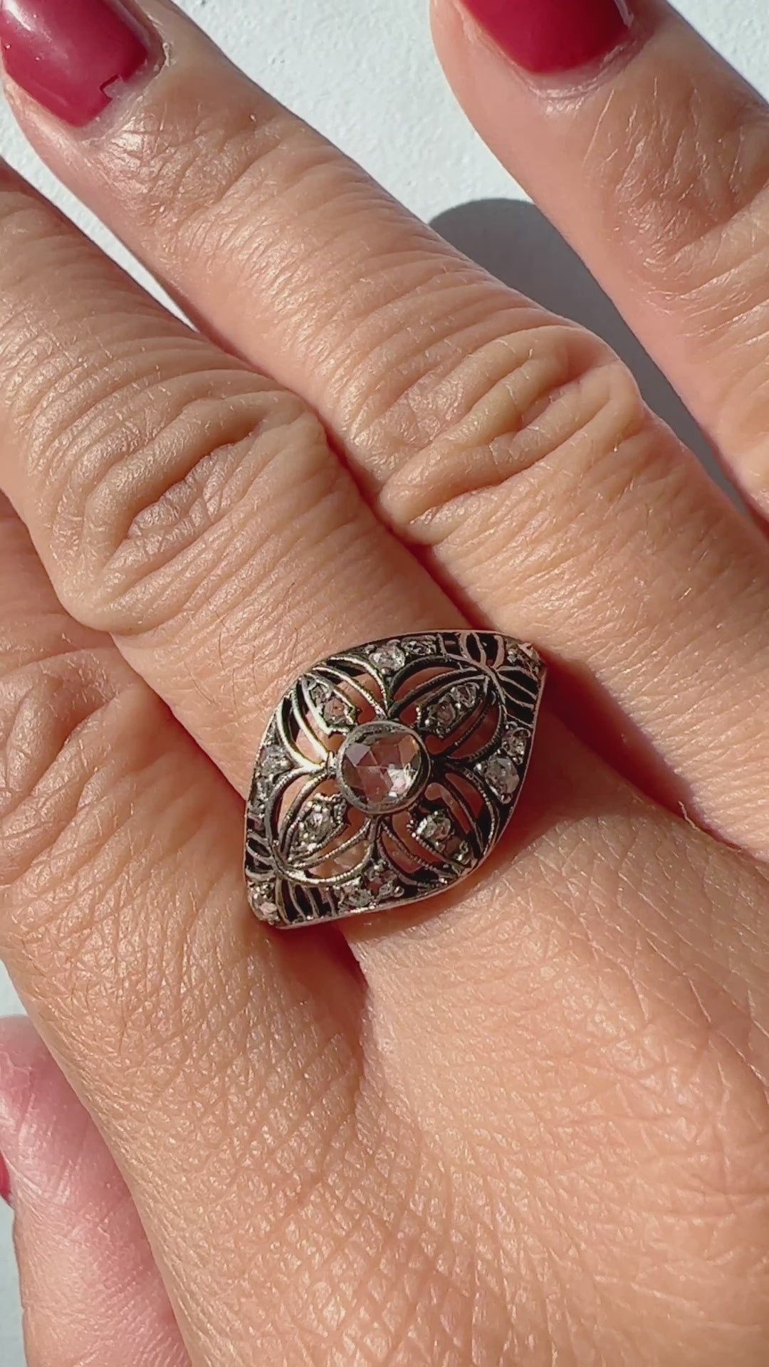 We love its central lace flower motif which carefully incorporated into the geometric patterns next to it. The central rose cut diamond measures 5mm in diameter and it has an estimated weight of approximately 0.25ct. Together with another 20 rose cut diamonds around, they wrap the finger with sparkles and brightness. The ring is mounted in 18K yellow (shoulder and shank) and white gold (head).