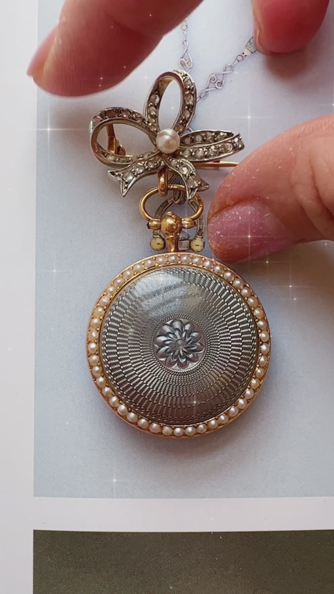 Edwardian 18k Guilloche Enamel pearl pocket watch pendant