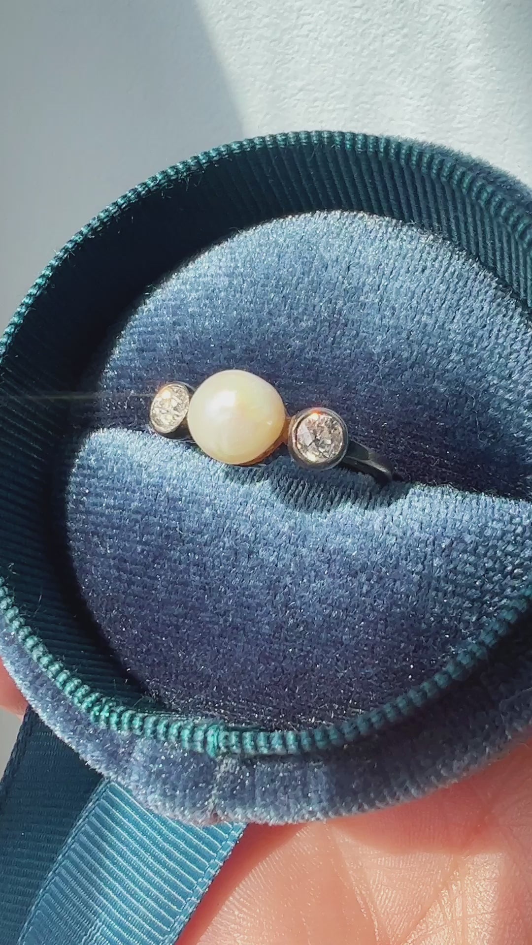 This very classic and elegant antique LFG (French Gemmology Laboratory) certified natural saltwater pearl and diamond 18K gold three stone ring is the essential and very valuable jewelry item which never go out of style! The softness and natural light spread out of the natural pearl is a just a pure joy to look at. The ring dates back to the early 20th century, the Edwardian era.