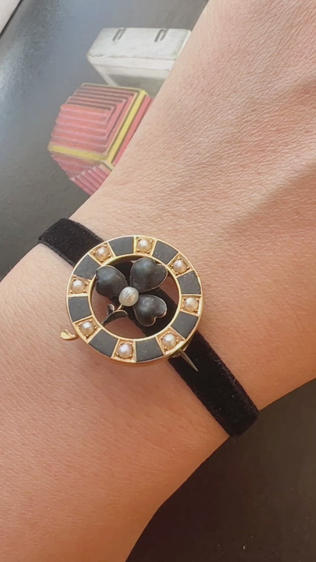Antique 18K gold pearl enamel clover shamrock brooch