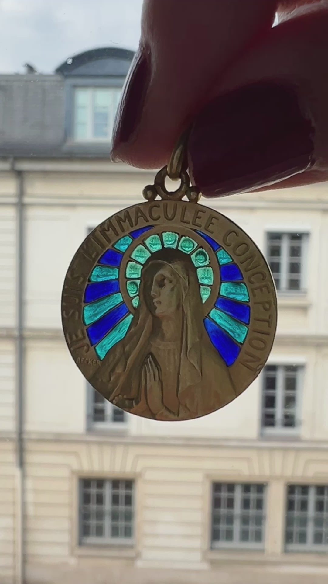 The gold frame is engraved with the inscription "Je suis l'Immaculée Conception" ("I am the Immaculate Conception"), adding a profound devotional touch to the piece. The pendant is in remarkable antique condition, with no cracks or missing enamel—an exceptional rarity for a piece of this age. The back of the medal pendant is not engraved.