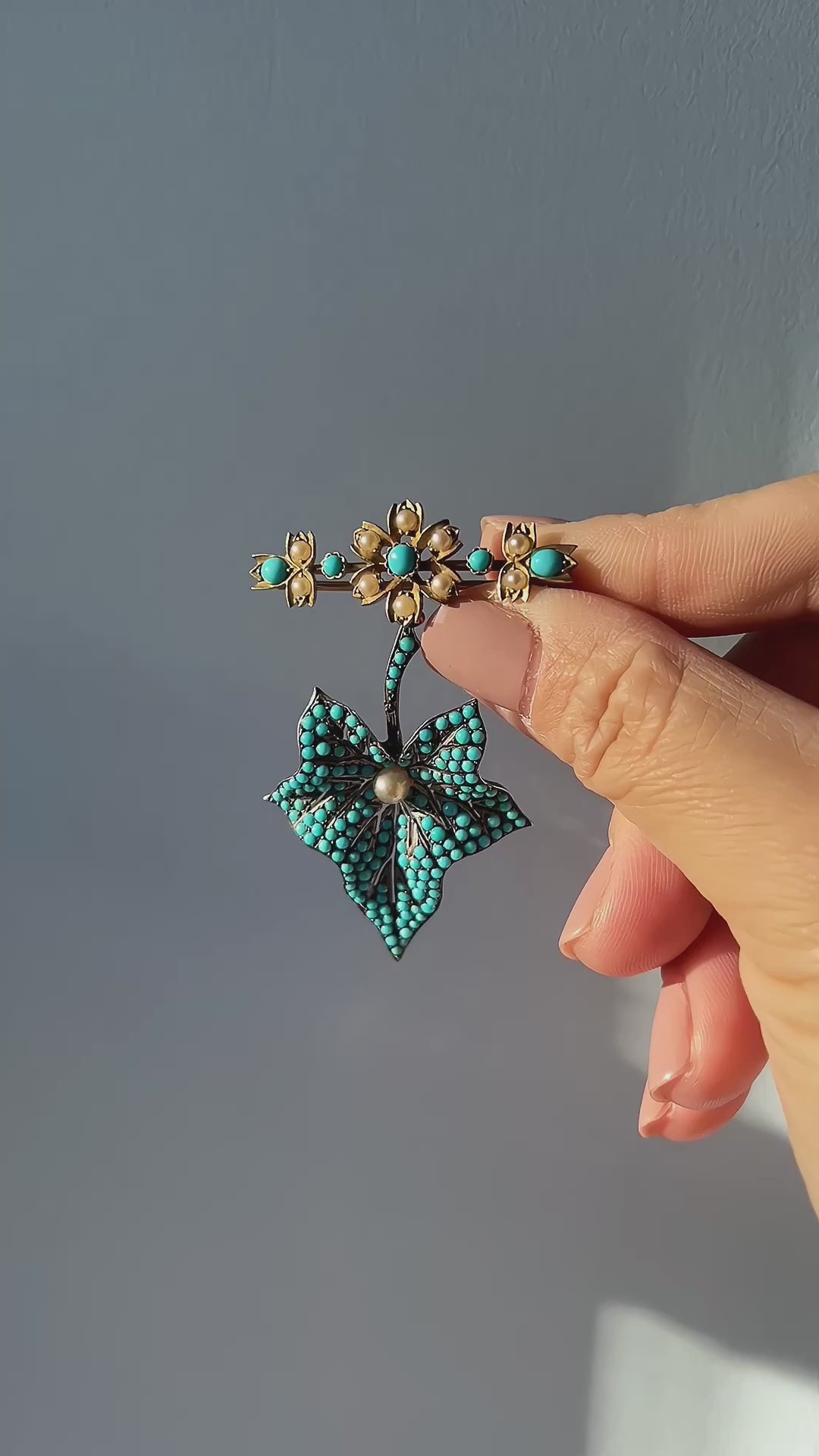 Victorian era 15k gold turquoise pearl ivy leaf brooch