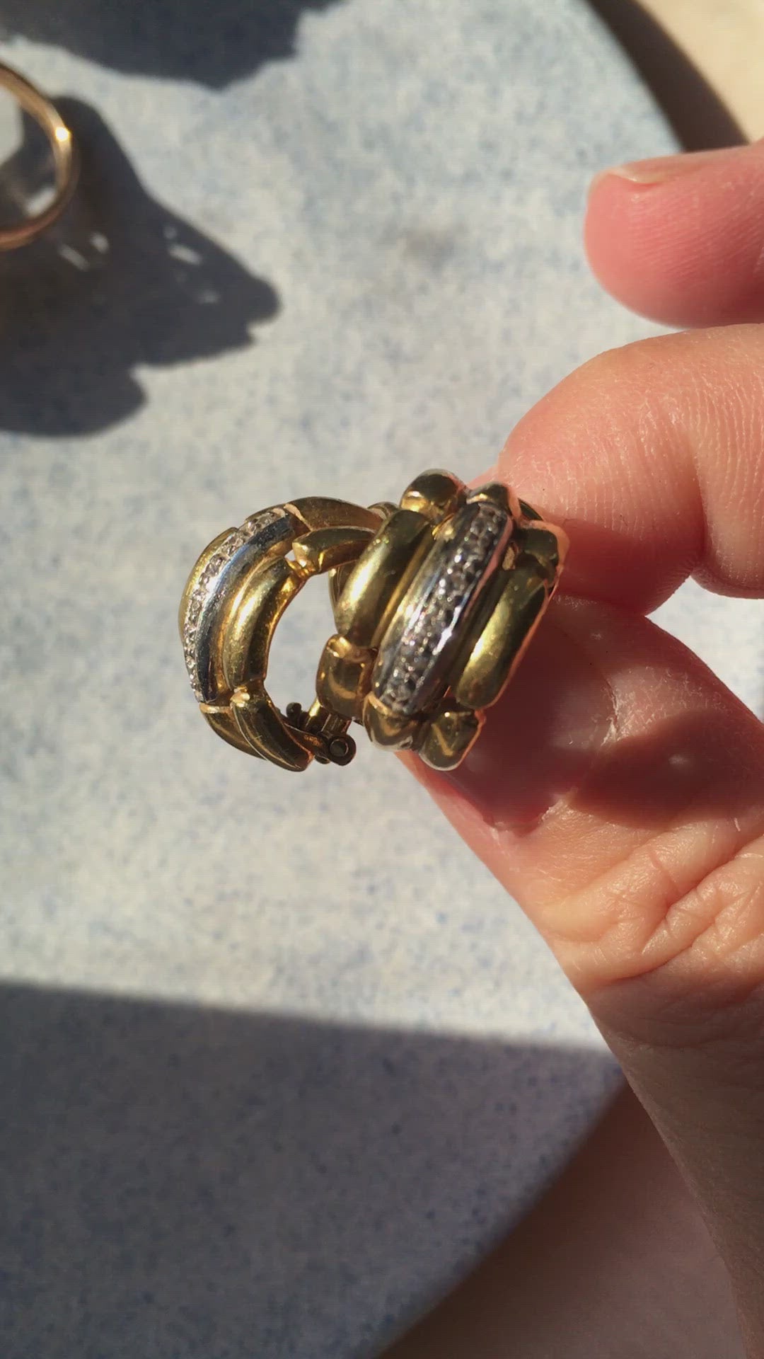 In front of us a classical & striking retro style earring in solid 18K gold with two lines of sparkling diamonds. They impressed us by their hefty weight of 9.43g in total, sculpted curves of yellow gold interacted with the white gold and timeless luxurious look which never go out of date.