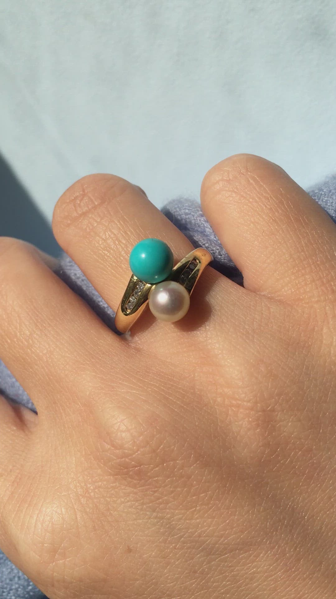 Here she is: Pearl for the sky, turquoise for the sea, diamonds for the dazzling stars around, and all beautifully mounted in 18k yellow gold! For sale one of the most romantic Toi et Moi rings we’ve never seen. Meaning “you and me” in French, Toi et moi refers to a ring with two gems that sit side by side or close to each other, symbolizing two souls becoming one. A classic toi et moi ring features two stones of a similar size and cut. In this lovely ring, the turquoise and pearl beads are perfectly matched and complete each other in color and in texture.
