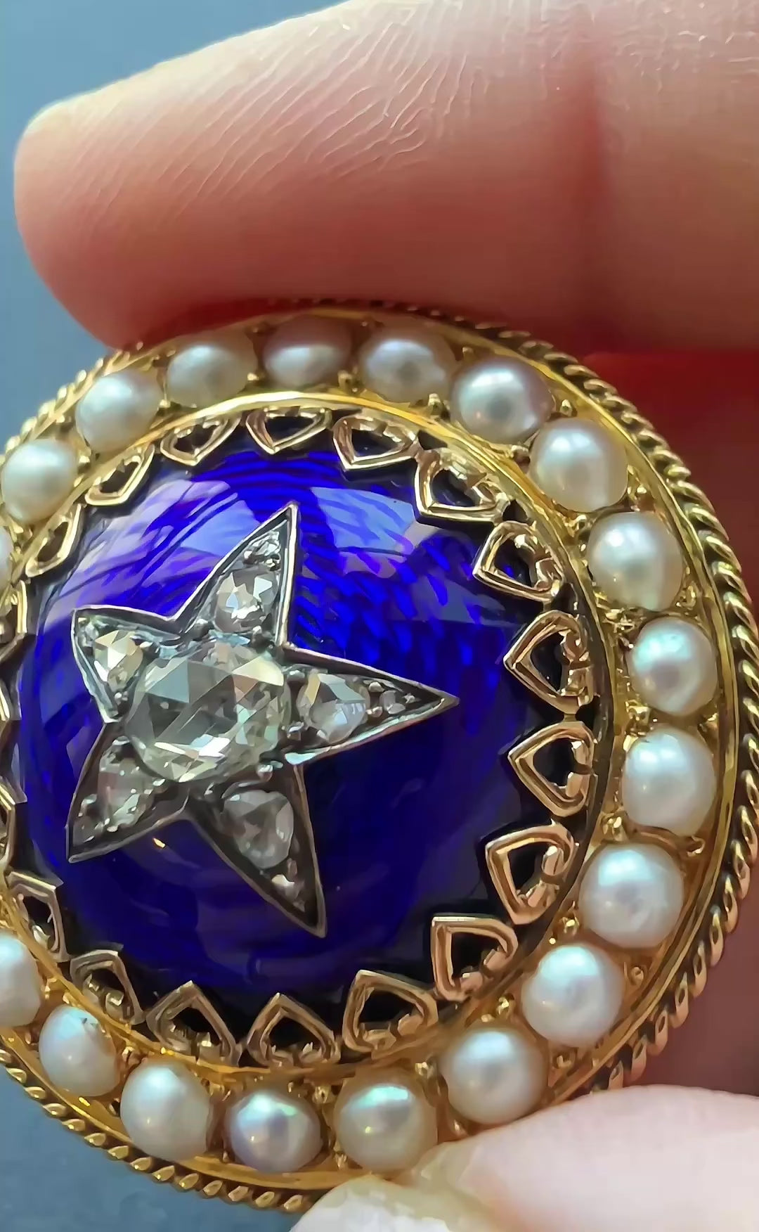 Discover the exceptional craftsmanship with this French antique 18K gold brooch (double French owl hallmarks), adorned with beautiful royal blue enamel.