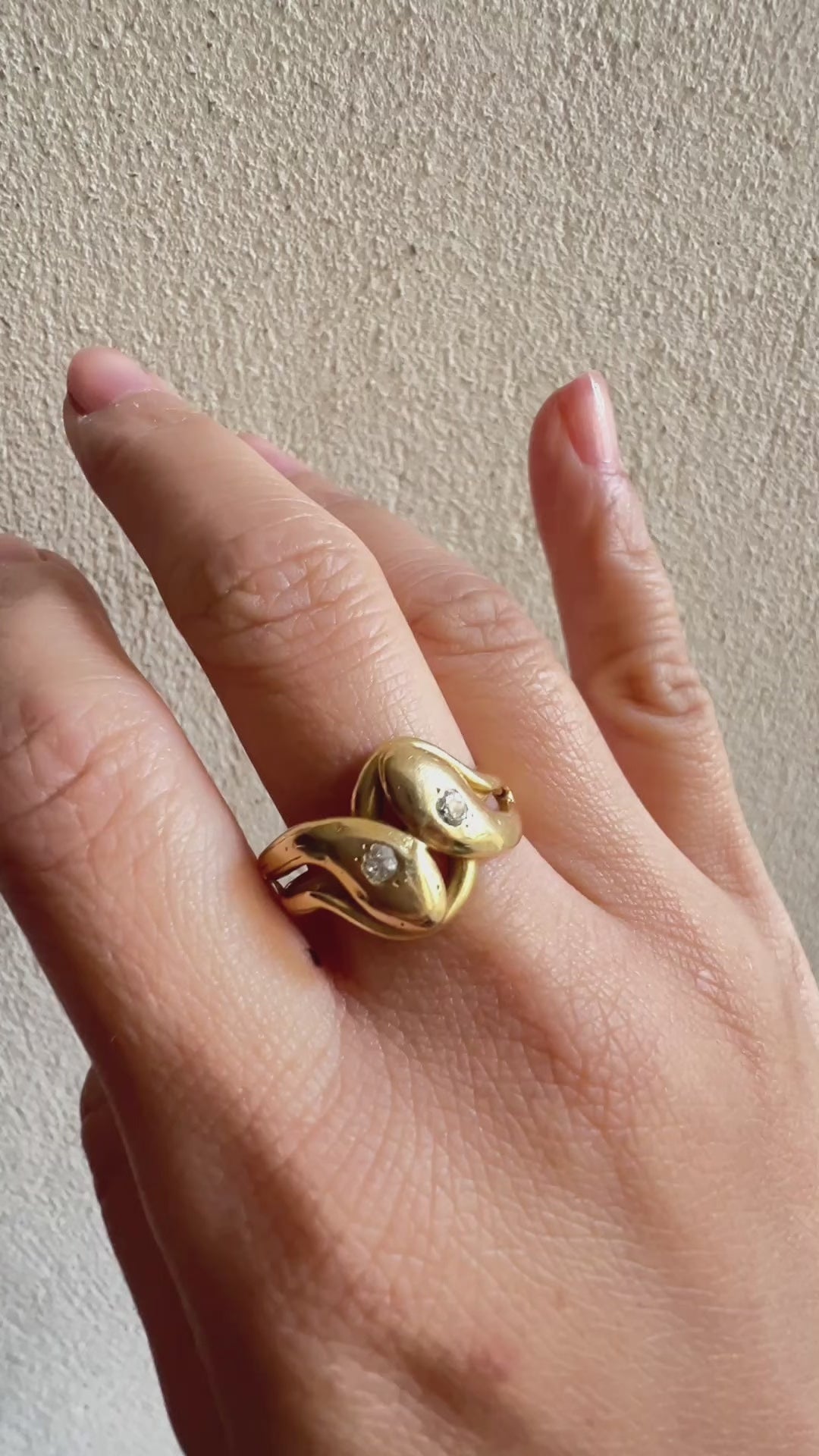 Hefty in weight yet remarkably comfortable, the ring sits beautifully on the finger, its chubby snake heads and buttery smooth, warm gold offering both presence and softness.