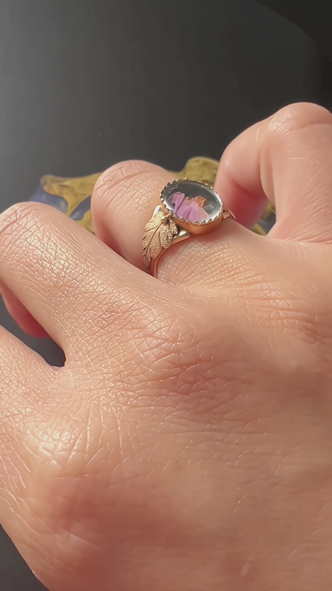 The box opens and closes well. There are already some dried flowers inside when we got the ring but you can store a small photo of your beloved, a lock of hair, or any other treasure close to your heart, keeping it safe and secure yet always within reach. The shoulders of the ring are decorated with refined leaf motifs on both sides. The ring is dated back to the 19th century, the Victorian era.