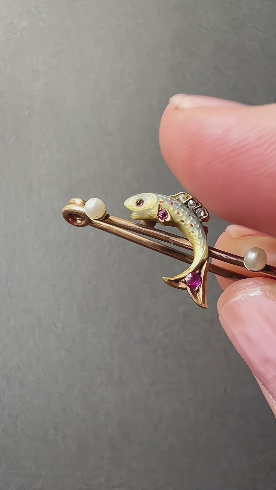 A true example of a novelty pin from the 19th century, this brooch reflects the period's burgeoning fascination with nature and its creatures. It is an extraordinary find, as it is our first known fish pin of its kind that can 'swim.'