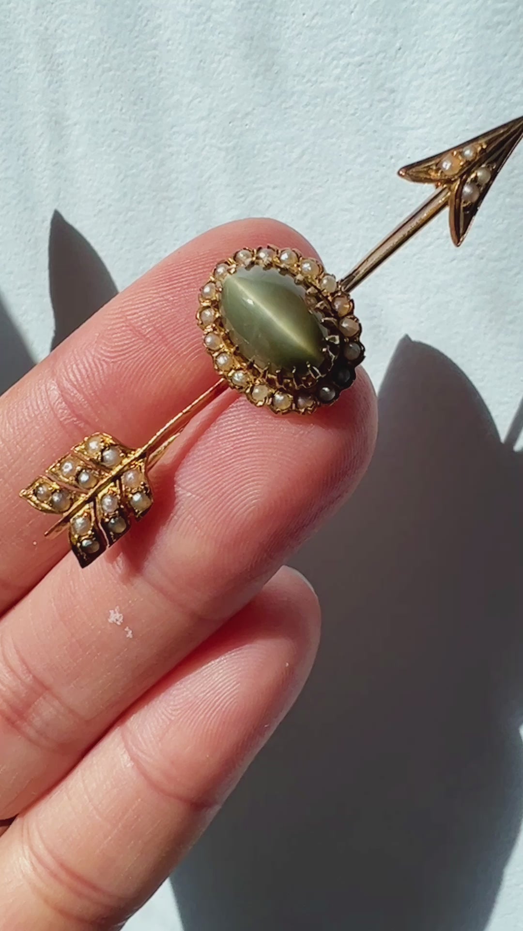 Victorian era 18K gold cat's-eye chrysoberyl pearl arrow brooch