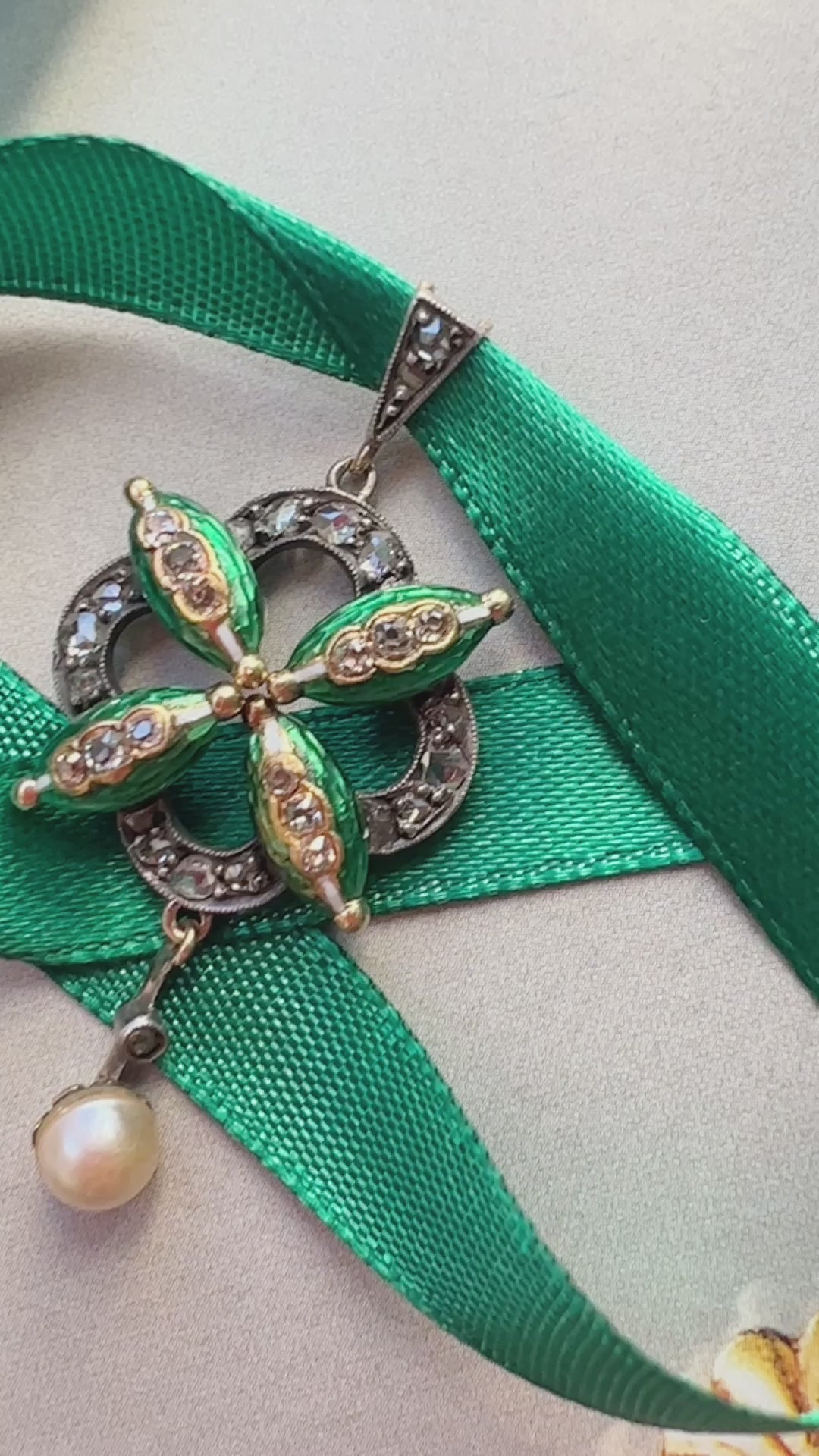 The four leaves in the center are decorated with 12 diamonds in rose cut style. They are set on a quilloché enamel patterns in vibrant green color. The bezel is integrated into a delicate white enamel. The frame of the pendant is made of another 12 rose cut diamonds; The total estimated weight of the diamonds is approximately 0.6ct. The diamonds are mounted first on silver and then backed with 18K yellow gold, which is typical to the Victorian era. The pearl at the bottom measures 5mm in diameter. It shows a very good luster and has a mirror like surface.