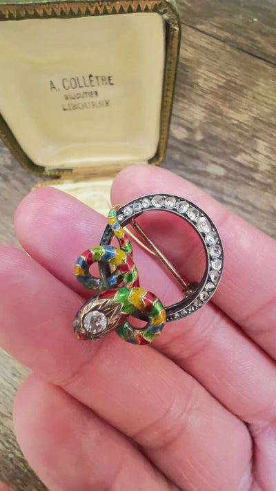 A magnificent French Victorian-era jewel crafted in 18K gold, featuring a colorful enameled snake coiling around a diamond-set crescent moon. The serpent’s body displays vibrant red, blue, and green enamel, with an old mine-cut diamond (~0.20 ct) on its head and two diamond eyes. The crescent is set with 19 rose-cut diamonds totaling approximately 0.80 ct, mounted in silver and backed on gold.