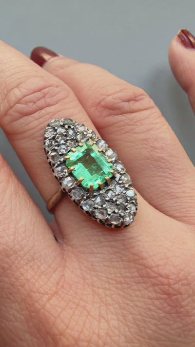An exceptional and rare Victorian-era ring from the 19th century, distinguished by its striking presence. The design centers on a large oval panel set with a vivid green emerald measuring approximately 9 × 7 mm and weighing an estimated 1.5 carats. The emerald displays a rich, lively green hue and a beautifully characteristic jardin, revealing the natural inclusions that speak to the gemstone’s unique nature.
