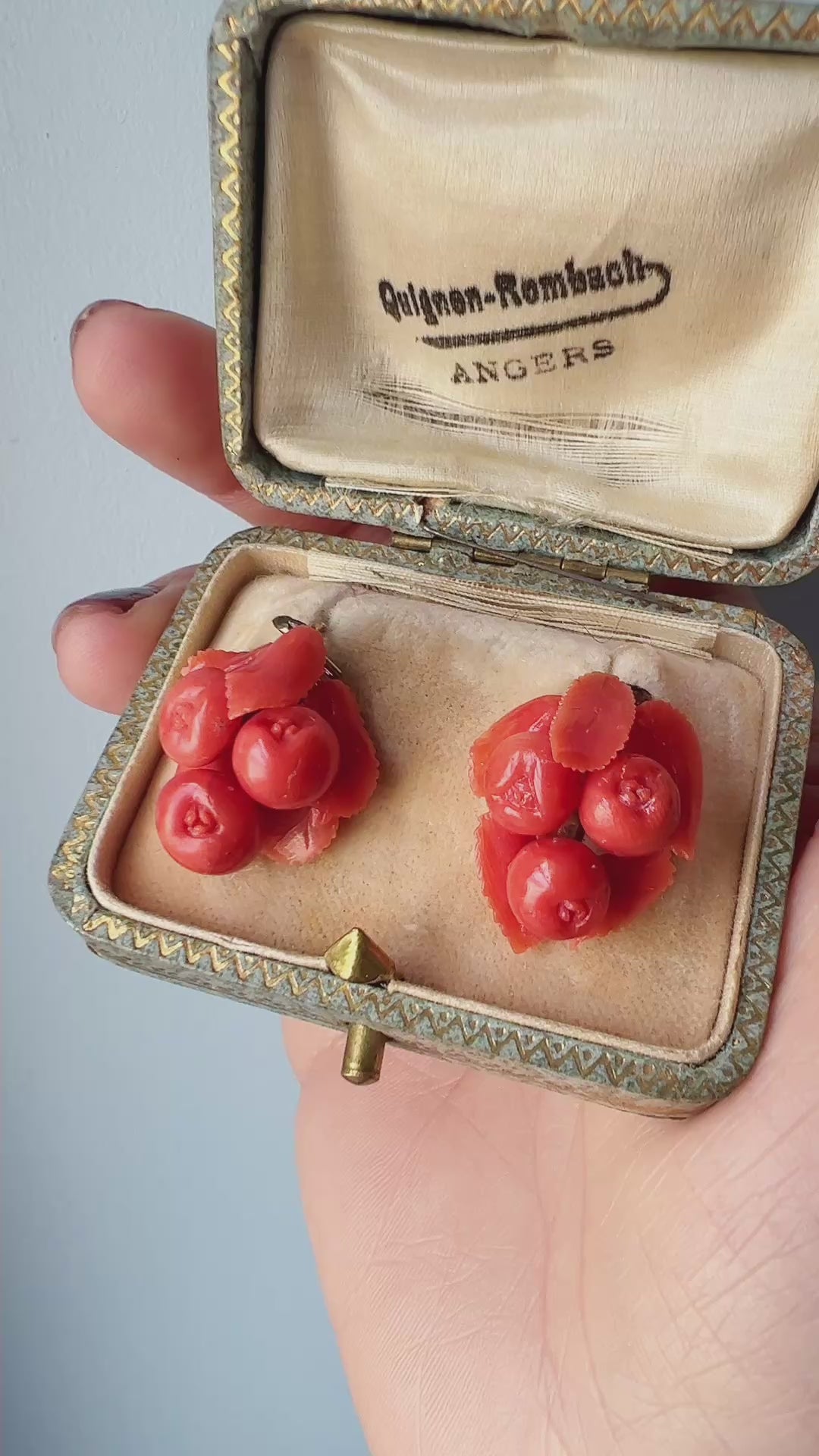 A rare and exquisite pair of Victorian-era earrings, these treasures celebrate the natural beauty of the Mediterranean Sea through meticulously carved coral. Each earring features a sculptural branch adorned with miniature fruits and foliage, masterfully hand-carved to evoke the lush fullness and ripeness of real, juicy fruit.