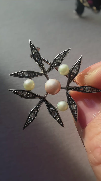 The floral leaves are embellished with shimmering rose-cut diamonds, their subtle sparkle beautifully complementing the organic glow of the pearls. The gemstones are set in silver, a hallmark of the Victorian era, while the brooch itself is made in rich 18K yellow gold.