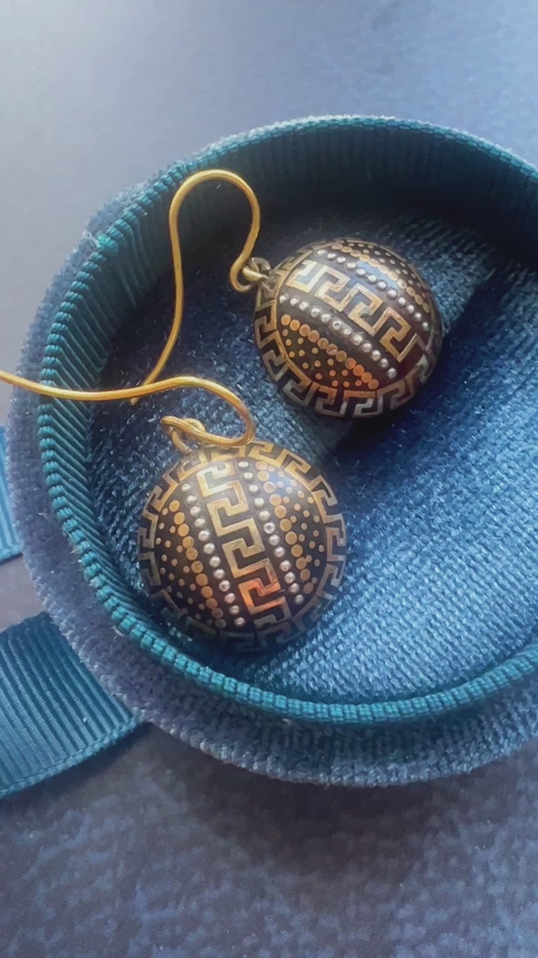 For sale a beautiful pair of archaeological revival shell earrings in deep brown color. They feature two rounded shell panel on which they are decorated with architectural and geometrical gold & silver inlays. The earrings have the 9K gold wires backing for pierced ears. They dated back to the mid 19th century, the Victorian era. They were probably converted from antique shell buttons.