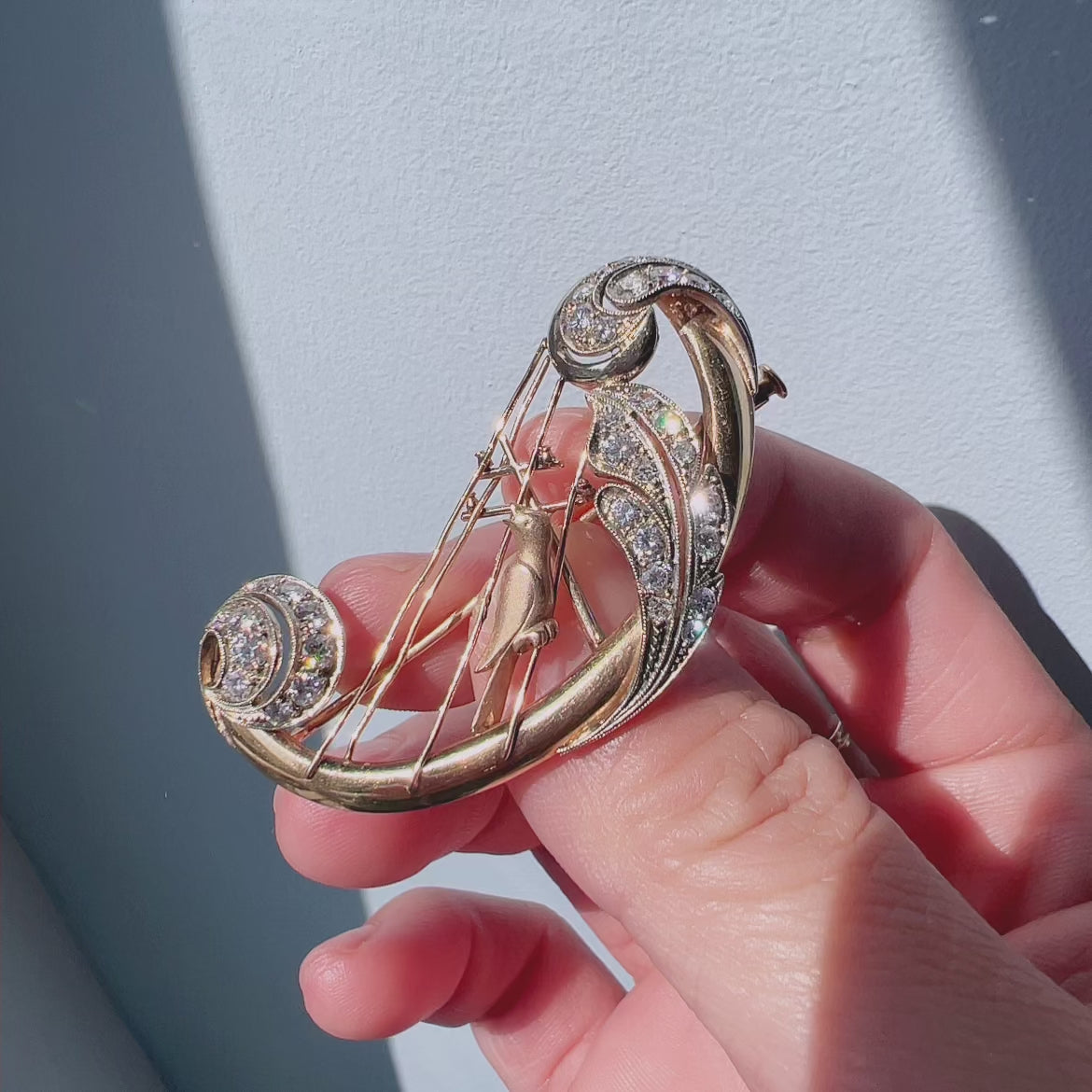For sale a 18K gold brooch, a breathtaking testament to the harmonious beauty of nature and the timeless elegance of fine craftsmanship. This lovely piece features a delicate depiction of a little bird perched on a harp, its melodic song echoing through the golden strings.