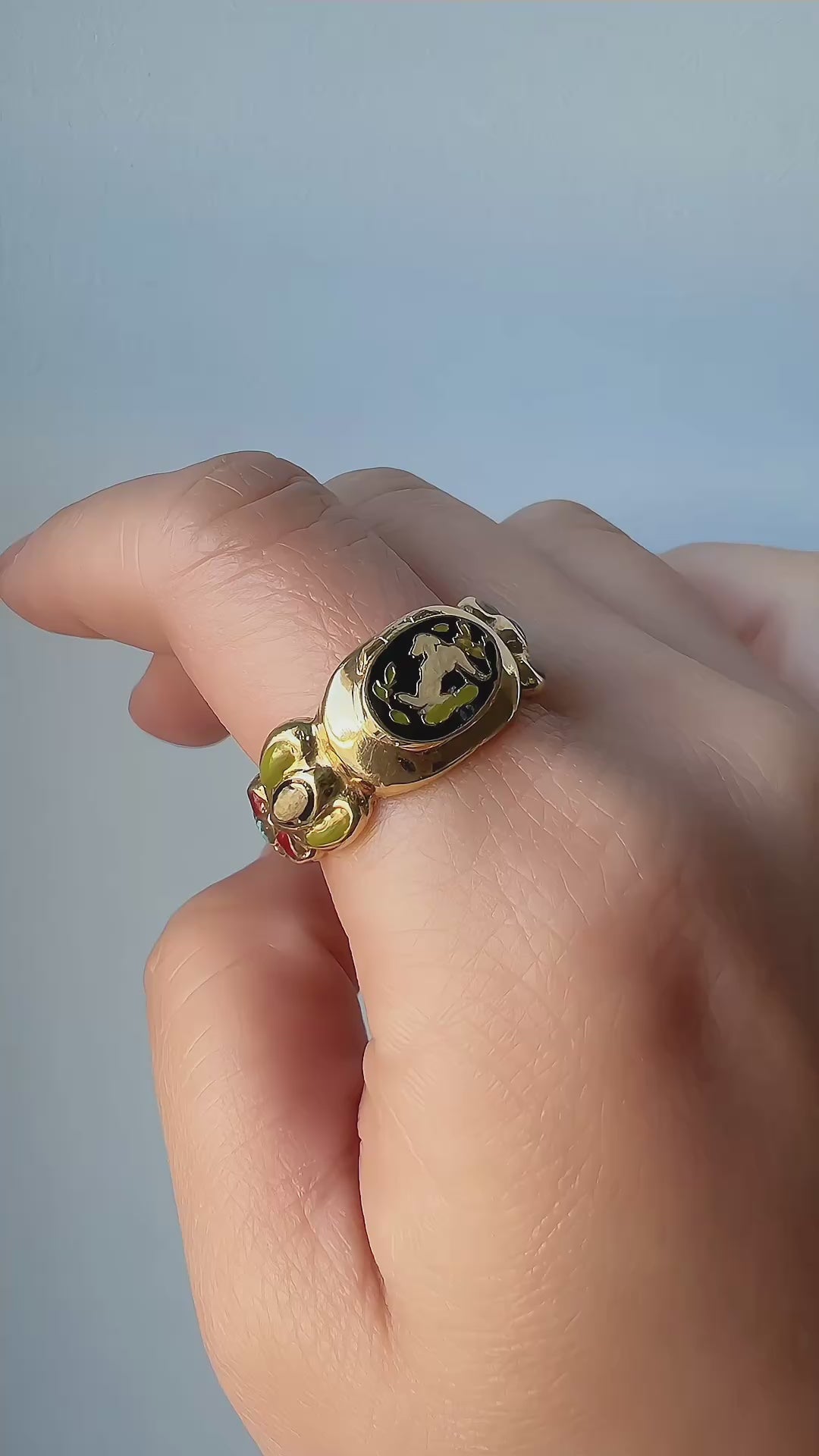 The ring's shanks are beautifully enamelled in vivid hues of green, red, black, white and blue, adding a vibrant, intricate touch to the design. Inspired by the popular secret box rings of the 18th century, this ring pays homage to the sentimental tradition of keeping loved ones close, even when apart.