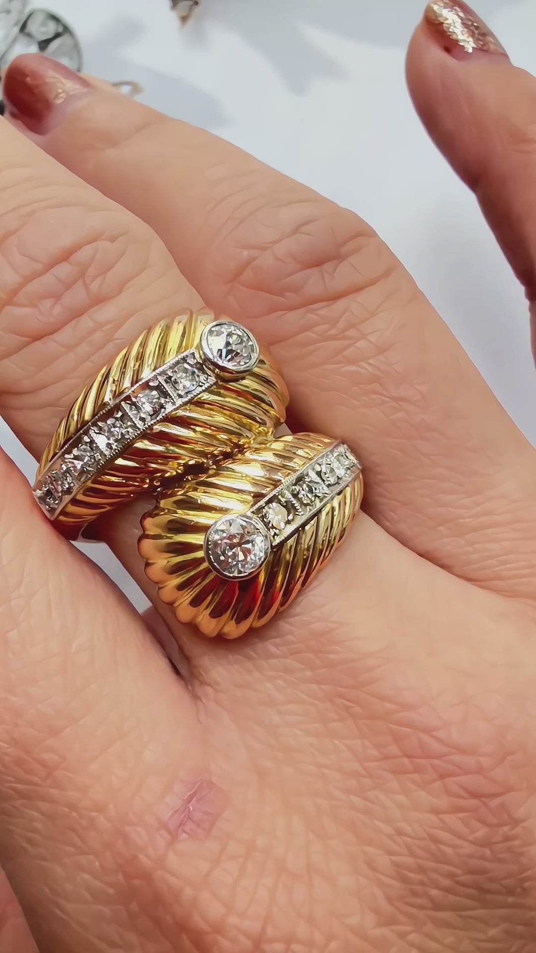 An important retro mid-century ring crafted in rich 18K yellow gold, designed with two sculptural feathers crossing gracefully over the finger. Each feather is accented with an old mine–cut diamond, further enhanced by a line of sparkling transitional-cut diamonds, creating beautiful contrast and depth.